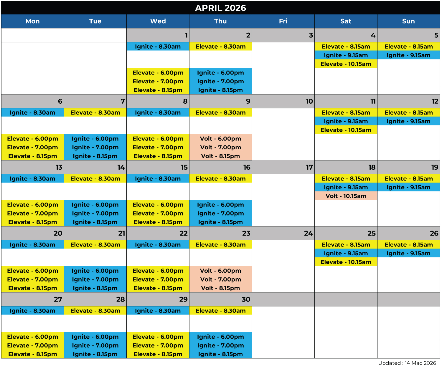 Whether you’re just beginning your fitness journey or ready to challenge yourself further, you can choose the class that suits your level. – Elevate (Beginner), Ignite & Volt (Advance)